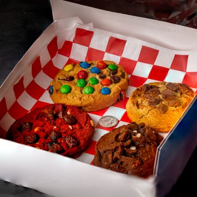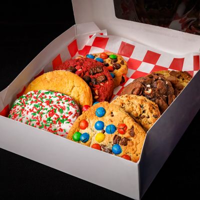 A COSMIC RED VELVET COOKIE WITH WHITE CHOCOLATE CHIPS, COVERED WITH BUTTERCREAM ICING AND HOLIDAY SPRINKLES.